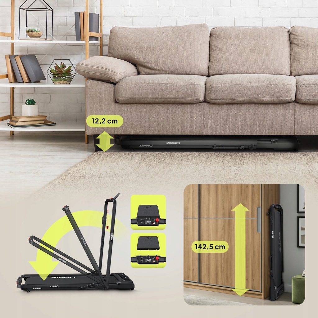 ZIPRO Newlite to wybór wygodnego przechowywania i komfortowych ćwiczeń. Jeśli jesteś miłośnikiem oszczędzania miejsca, a Twoja domowa siłownia nie ma swojej wydzielonej przestrzeni ta bieżnia to idealna maszyna dla Ciebie! Podczas ćwiczeń możesz trenować ze złożonym lub rozłożonym uchwytem. Od Twojej wygody i przyzwyczajenia zależy, czy będziesz korzystać z WalkingPada, mając w zasięgu wzroku komputer, czy też nie. Bieżnia ma tylko 12,2 cm wysokości po złożeniu, co sprawia, że urządzenie możesz z powodzeniem przechowywać nawet pod łóżkiem. Dodatkowo pokrętło blokujące uniemożliwia przypadkowe złożenie maszyny, co sprawia, że całość jest naprawdę bezpieczna.